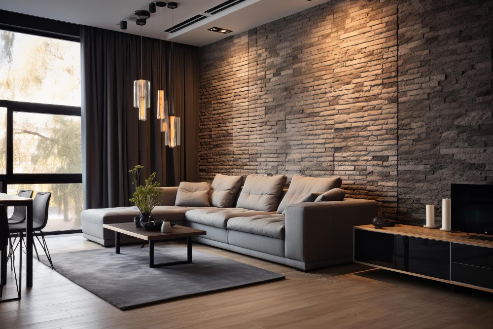 Contemporary,Living,Room,With,A,Gray,Sofa,On,Dark,Wall